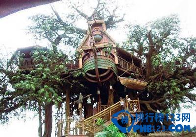 早期的树顶旅馆完全搭建在几棵大树杈上,目前的建筑仍为全木结构,只是大树杈换成了数十根大木柱。