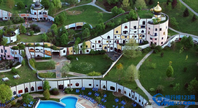 奥地利建筑艺术家百水先生(Hundertwasser)的风格在这里发挥得淋漓尽致:一组公寓群,竟将房舍嵌进了地下,如同一座座土拨鼠的地穴;别墅群的顶端种植着绿油油的草坪和灌木,甚至连窗户里都会探出一棵棵的树来,令你对建筑的认识被彻底颠覆。从温泉酒店的游泳池一路游到温泉池,无规则水路忽左忽右、忽上忽下,眼前的景致一会儿是波斯宫殿,一会儿又变成了斑马小屋,令你忘记人世间所有的游戏规则。