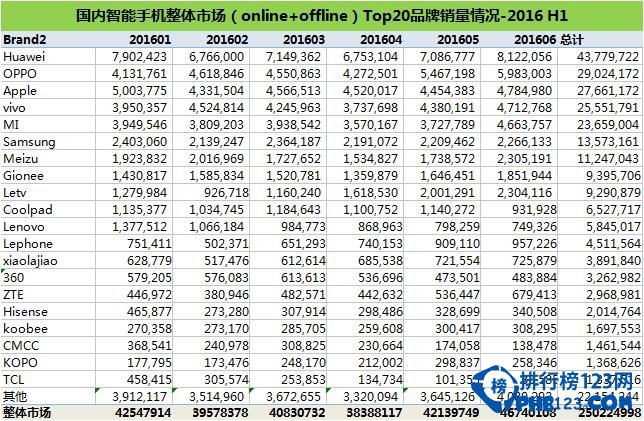 数据显示,2016年上半年国内智能手机整体市场销量为2.5亿,其中华为销售量达4377万,坐稳国内市场的头把交椅,OPPO、APPLE分别以2902万和2766万的销量分列二、三位。