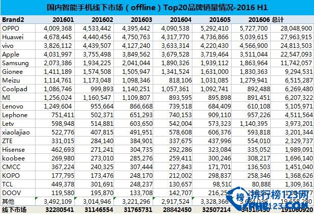 从线下市场的销售数据可以发现,OPPO的线下渠道优势得以彰显,1至4月份其与华为交替占领第一的位置,5、6月份则已较大优势领先。另外,线下市场前三名均为国产手机,苹果线下销售量持续下滑,与前三名的差距逐渐加大。