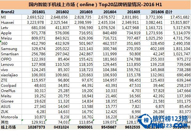 竞争最为激烈的是在三、四、五名之间,从6月份的数据来看,第三名的Apple与第五名的小米之间只相差12万的销量。另外值得注意的是,1至5月份单月销量始终在300多万徘徊的小米,在6月份有了巨大提升,销量达到466万。