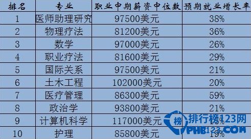 今年位居榜首的专业是医师助理研究(Physician Assistant Studies),其职业中期薪资中位数为97,500美元,未来10年预期就业增长率高达38%。根据美国劳工统计局的定义,医师助理的工作内容是“在内外科医生监督下以团队形式行医”,以及“受过相关正规教育,可以检查病人、诊断伤病和提供治疗。”