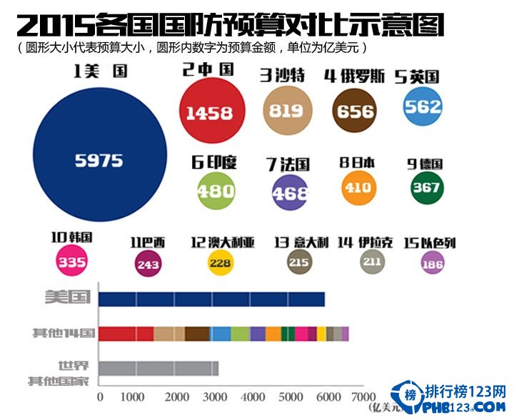 国防预算大国排名,中国军费预算居于世界第二位,但同美国还差得远,奥巴马政府已经为2016年申请5850亿美元军费预算,按照财政预算,2015年中国国防支出将增10.1%,已连续5年呈两位数增长。排行榜123网(www.336c.com)为你揭秘2015国防预算排行榜。