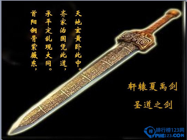 圣道之剑。黄金色的千年古剑,传说是天界诸神赐于轩辕黄帝击败蚩尤的旷世神剑;由众神采首山之铜为黄帝所铸,后传与夏禹。剑身一面刻日月星辰,一面刻山川草木。剑柄一面书农耕畜养之术,一面书四海一统之策。为传说中的神剑。
