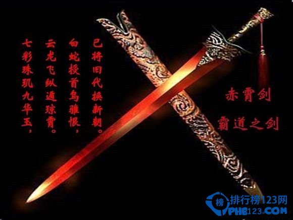 帝道之剑。赤霄:汉高祖所得,铁,铭曰赤霄大篆书,三尺,高帝以秦始皇三十四年得于南山及贵常服之斩蛇。 高祖刘邦佩剑,起义时有铸剑师打造的青铜剑。剑身仿秦剑。秀有花纹。“斩白蛇、提三尺剑立不世之功”都指这把剑。是中国历史上著名的宝剑。颇具历史价值。