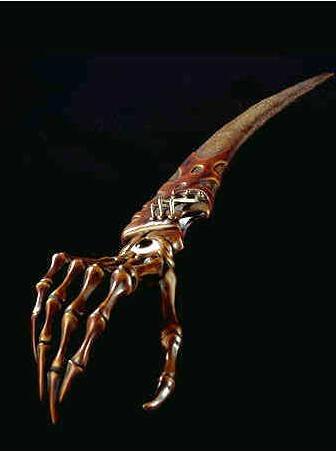 十七世纪欧洲的一个农名用天上掉落的陨石打造的,很奇怪的是这把刀的不管在多么低温的环境下都能保持20℃的恒温,而且用这把刀割开的伤口会流血不止,那农名的妻子和孩子就先后被这把刀割伤后流血不止而死,后来农名将它送给了一个路过的僧侣,而那僧侣也在旅行中虚脱而死,所以传说这是一把能吸血的刀。鬼手这样危险的冷兵器当然是世界十大禁止冷兵器之一了。