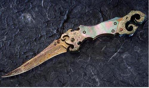 这把刀是十四世纪意大利的一个疯铁匠所铸,他将自己妻子的右手砍下做成刀柄,后又将儿子肋骨做成刀刃,并把自己的小腿骨做成刀柄,献给了当时的债主,三天后债主发疯将自己一家人全部烧死了,据说后来得到这把刀的人全都发疯了,而且会像受到诅咒一样一家人全死亡!!
