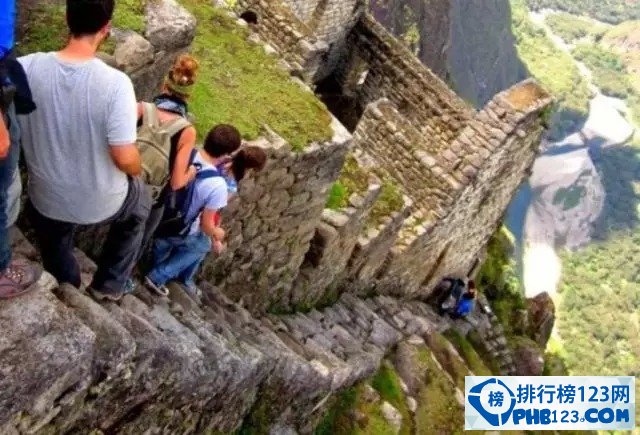 从瓦伊那比丘山的山顶俯瞰马丘比丘(MachuPicchu),这样的绝景是非常壮观的。然而,要到那边的路也是相当危险的。这个步道有近乎垂直的楼梯、同时游客还要小心有高山症的危险,甚至连当地的导游自己都很小心(在过去几年间,也有很多人在此不幸身亡)。