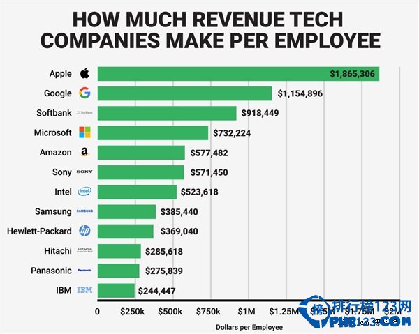 衡量科技企业的卓越成就之一在于尽可能用更少的员工来创造更高的价值和营收。悲观主义者可能认为这是糟糕的事情,但是这些科技企业并不需要太多的员工来产生巨大利润,而且很多机械工作已经开始大量引入机器设备。那么我们将这些科技企业所产生的总收入平均划分到每个员工身上,那么像苹果、谷歌和微软这样的科技企业每名员工能够创造多大的价值?排行榜123网(www.336c.com)为您揭秘科技企业员工价值排行榜。
