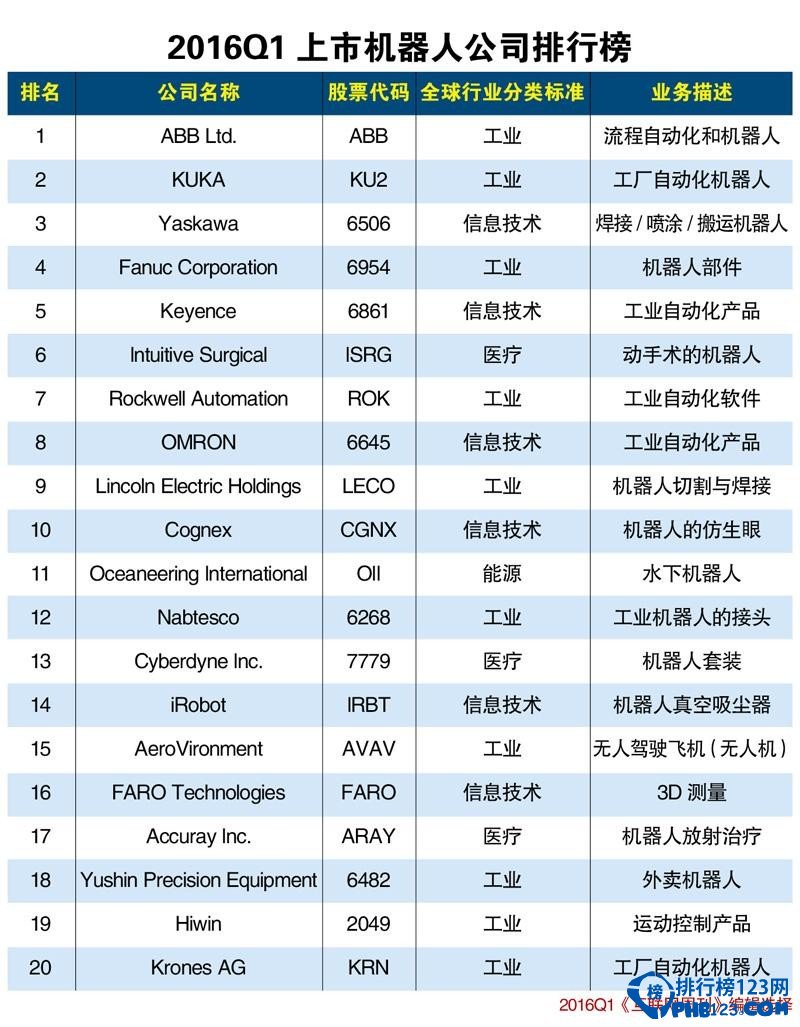 所以,以机器人为代表的智能机器正成为上市公司眼中的香饽饽,越来越多的公司纷纷加码或转型机器人业务。机器人不仅能促进产品质量的提高,还能降低高昂的物料消耗,并且减少稀缺能源资源的使用。它们凭借高度灵活的自动化能力,取代了十五年前还广泛使用的呆板、昂贵的特殊机械制造。过去,工业机器人几乎仅应用于汽车行业和大批量生产领域,但是现在越来越多的机器人公司开始进入了汽车工业以外的许多其他行业,并主要以新兴市场中的应用为目标,尤其是食品、塑料、金属加工、铸造、电子、医疗技术和娱乐行业等等。这些具有光明前景的机器人企业令许多投资者激动不已,但对普通大众来说,如果想要投资其中分一杯羹的话就只能等这些优秀的机器人企业首发上市(IPO),或者被其他上市公司收购。这类公司虽然少,但也不是没有,我们结合了国外优秀机器人企业的业绩、产业布局以及综合实力等盘点出了2016Q1上市机器人公司排行榜。排行榜123网(www.336c.com)为你分享2016Q1全球上市机器人公司排行榜。