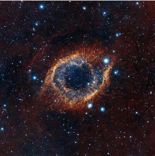 据英国《每日电讯报》报道,欧洲天文学家日前从浩瀚太空拍摄到看似目不转睛的“宇宙眼”的壮观照片,并称之为“上帝之眼”。上帝之眼是在1780年被一位叫查尔斯·迈歇尔发现的。上帝之眼即螺旋星云,NGC 7293星云。之所以命名为“上帝之眼”是因为从图片来看,与人类的眼睛像极了,蔚蓝色瞳孔和白眼球的四周是肉色的眼睑。所以人们通常称为螺旋星云为上帝之眼。
