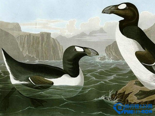 大海雀是一种古怪的黑白相间的不会飞行鸟类,也被称为“原始企鹅”,它们直立高度大约1米,但是翅膀非常小,仅有15厘米长。几百年前,数百万计的大海雀栖息在北大西洋海岸,但是由于它们繁殖能力非常低,每次只产一枚卵,并且暴露在地面上,很容易被掠走。它们灭绝的主要原因是人类捕杀,1844年宣布该物种灭绝。