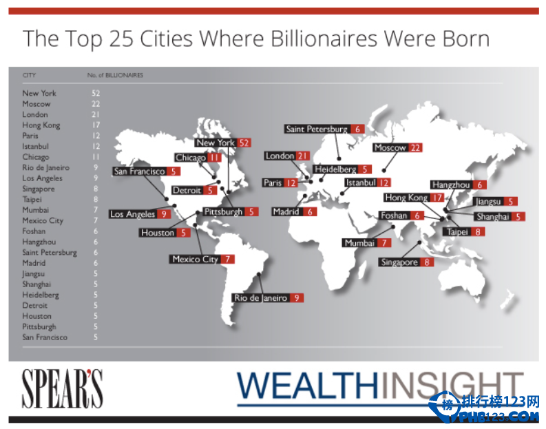Spear’s杂志和研究公司WealthInsight分析了全球10万个高净值资产人士的数据,发现在每100个富豪中,超过1人出生于伦敦,其比例为1.25%。排在第一的是纽约,比例达到3.09%,其次是莫斯科,出生的富豪人数分别为52人和22人。中国有6个城市入围,分别是香港、台北、佛山、杭州、江苏和上海。