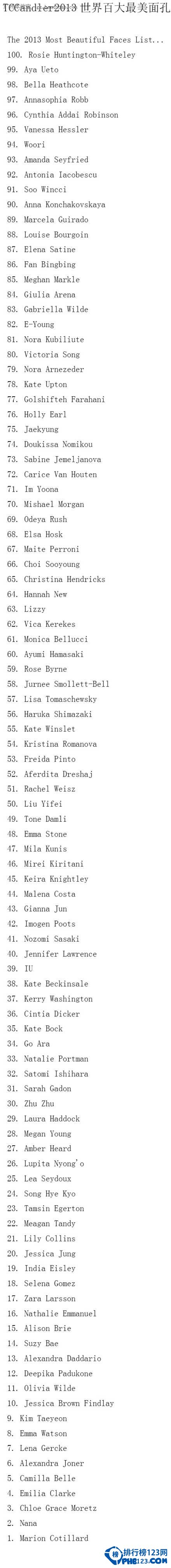 可能对很多来说,有些评判标准并不是唯一的,因为每个人的审美观点不一样,但是有些美女是被公认的,她们的美貌确实能吸引太多的人。近日,由知名电影网站TC Candler公布“百大最美脸蛋”2013年票选结果,法国影后玛莉咏柯蒂亚(Marion Cotillard)夺冠、第二名则为韩国女团After School成员Nana,荣登亚洲女星最美。另外,刘亦菲和范冰冰则分占第50和86名。