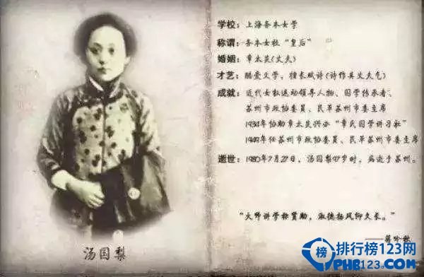 1905年秋,汤国梨入上海务本女学求学,初次接触新思想新文化,眼界大开,思想更为激进,誓作女中之豪杰。从务本女学毕业后,从事教育工作。