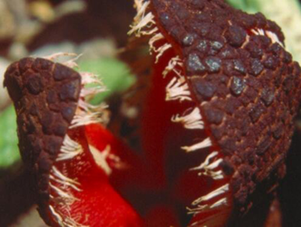 非洲白鹭花是一种十分奇特的肉色的寄生性花类,主要寄生在其他的树木的根部,并且花朵味道十分难闻,甚至就像粪便一样,样子也十分丑陋,就像一条张开大嘴的蛇。