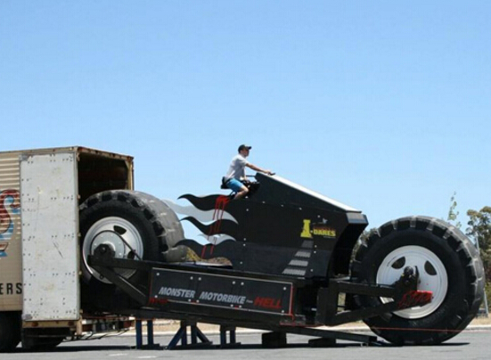 这款世界上最大的摩托车名叫Monster Motorbike from Hell(中文意思:从地狱来的摩托怪兽),长达9米,高为3.1米。真可谓是一辆巨无霸,它能轻松的将一辆汽车压成饼干。这辆怪兽来自澳大利亚,澳大利亚人为它装配了一台柴油卡车引擎,还配备了6速自动变速箱。相信开着这么一部摩托车上街,何止是拉风,就连飞机上的乘客也会往下看看这究竟是什么机器怪兽。