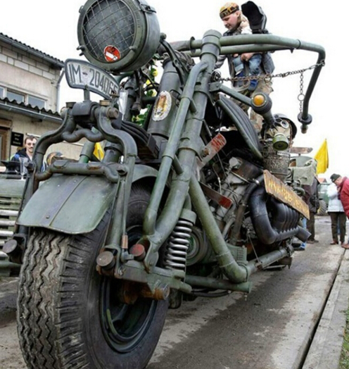 在东德,一伙以Tilo Niebel为首的发烧友在一个叫Zilah的村庄里展示了他们手工组装的摩托怪兽。其实要控制这辆巨大的摩托车需要学会使用2米长的驱动器,车辆引擎使用的是800马力的T55坦克引擎。