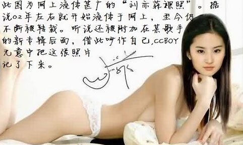 近日某论坛上曝出大量刘亦菲裸体艳照,立即惹怒刘亦菲粉丝团。照片中的刘亦菲全身赤裸、搔首弄姿间直视镜头,毫无羞涩之感,这组裸照的流出令刘亦菲清纯形象一落千丈,很多网友称没想到神仙姐姐刘亦菲还拍摄这么大尺度的照片。
