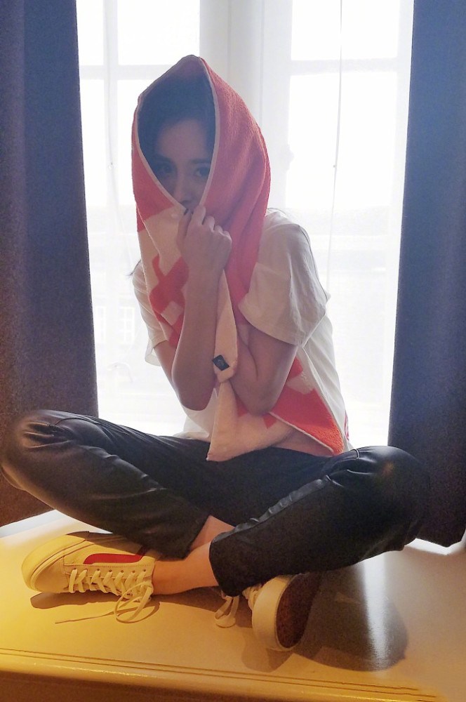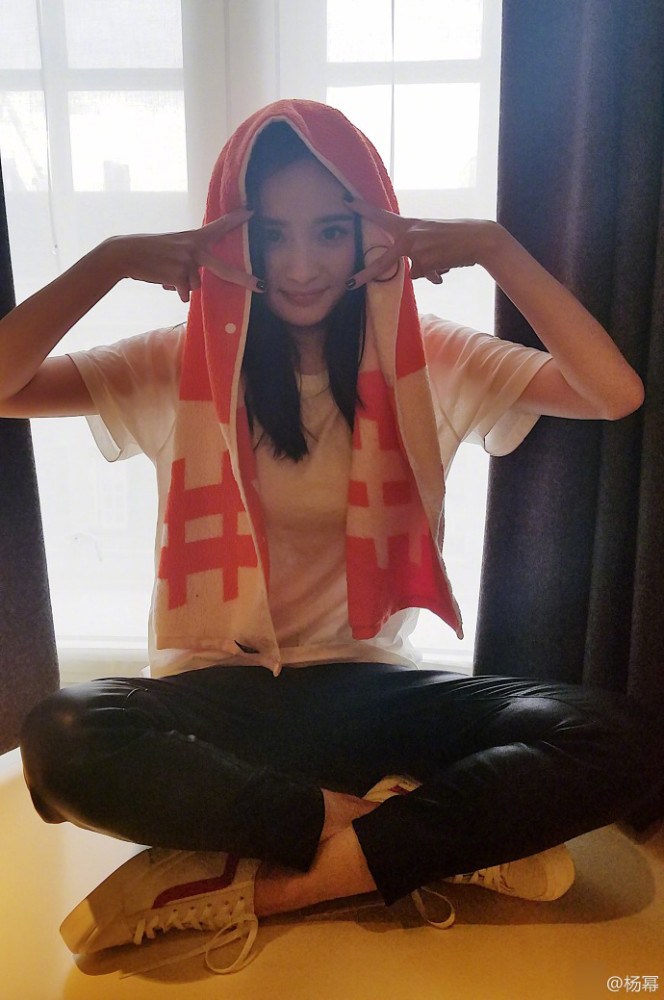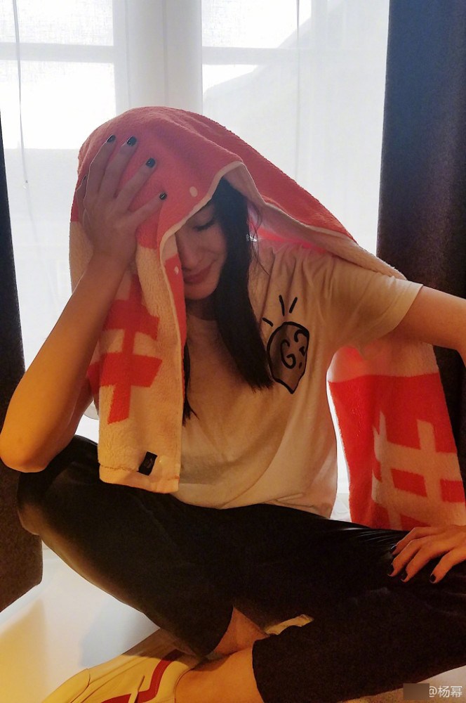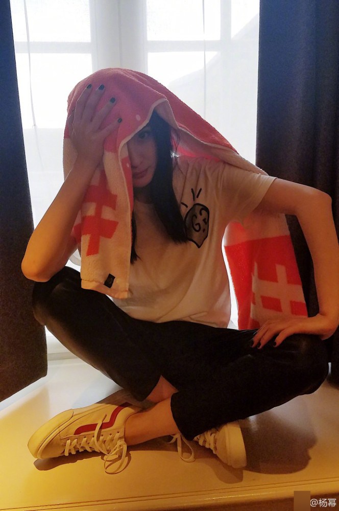 5月17日晚,杨幂工作室晒出一组杨幂的四宫格搞怪图,照片中杨幂盘腿坐在桌上,头上披着一条橙色毛巾,镜头前的她时而比“V”卖萌,时而陷入沉思,时而耍酷,真可谓花样百出。
