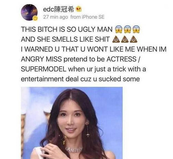 沉寂多年的陈冠希脾气依然火爆,作为一个公众人物,在社交平台当众辱骂一个女人,很多爷们都说:太没绅士风度了,脏。