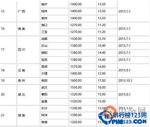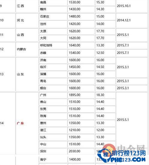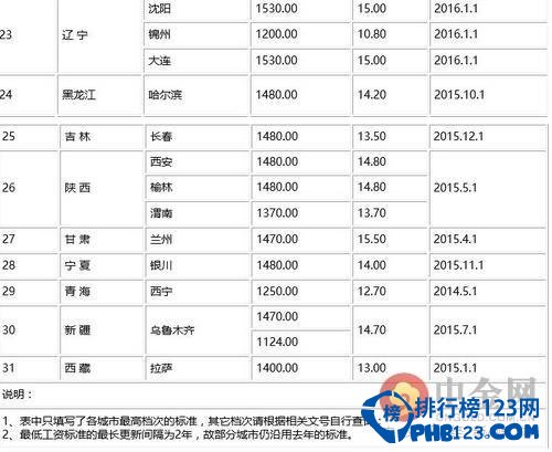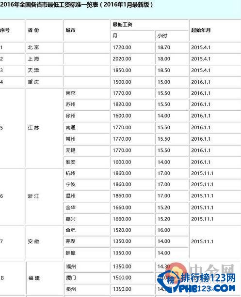 2016全国工资最低标准表完整数据