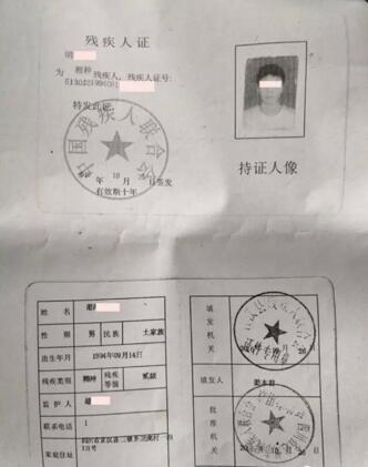 在宣汉县三墩乡龙虎村时,当地村组干部提供的胡某残疾证复印件显示:2010年10月25日,宣汉县残疾人联合会向胡某东颁发了残疾人证,其残疾类别为“精神”,残疾等极为“二级”,其监护人正是父亲胡大平。“他的病时好时坏,发作起来就没法管。”胡大平说。