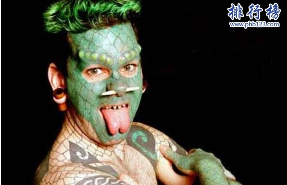 上面说了虎人,现在就要说说蜥蜴人了。埃里克•斯普瑞格为了使自己长得更像蜥蜴,不仅在皮肤上纹满了蜥蜴的花纹,在皮下植入很多“角”使自己更像蜥蜴,甚至于给自己的舌头做了分叉,真的不知道用什么话来形容他的这种做法。