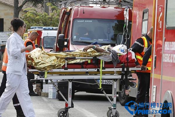 10月23日,法国西南部吉伦特省发生客车与货车相撞事故,造成至少43人死亡。图为救援人员把一名伤者抬上救护车。