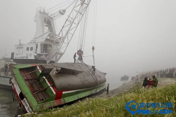 2月22日,一艘载有约150名乘客的渡船在孟加拉国马尼格甘杰境内的帕德玛河上与一艘货船相撞后沉没,造成至少65人死亡。孟加拉国河流密布,船运是主要交通方式之一。由于不少客轮年久失修、超载严重,船只航运事故时有发生。图为救援人员打捞起倾覆的船只。