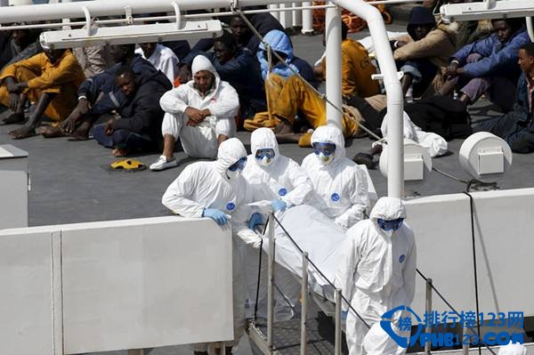 www.336c.com4月18日,一艘搭载约700人的偷渡船在利比亚附近的地中海海域沉没。官方统计显示,只有近50人获救,另外数百人恐已遇难。图为身穿防护服的马耳他军人将遇难者遗体抬下船。