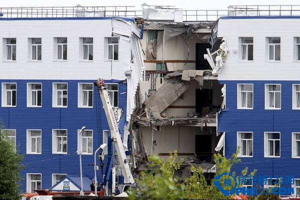 7月12日,俄罗斯南部鄂木斯克市郊的空降部队训练中心一幢楼房部分坍塌,造成至少23名军人死亡。图为发生坍塌事故的军事训练基地建筑。