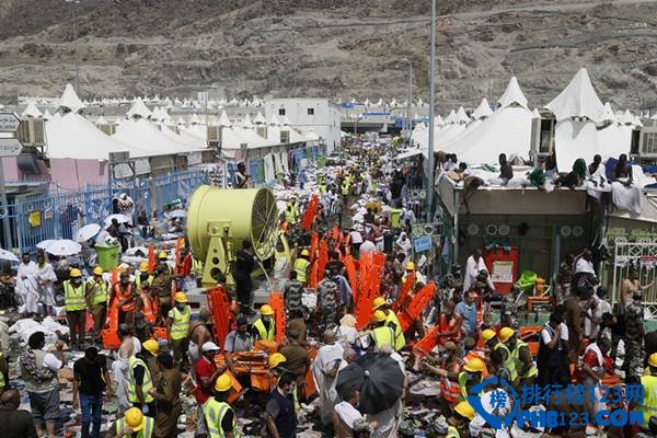 9月24日,距离沙特阿拉伯麦加市中心数公里外的朝觐地米纳发生踩踏事故,造成至少769人死亡,934人受伤。这是近25年来麦加朝觐事故中最严重的一次踩踏事故。图为人们聚集在踩踏事故现场。