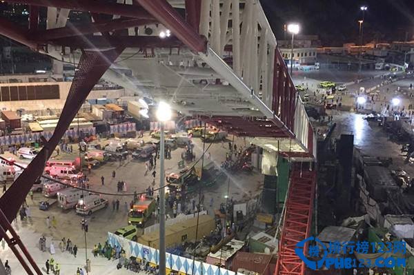 9月11日,正在沙特阿拉伯麦加大清真寺内施工的一台巨大塔吊突然倒塌,砸向正在寺内进行宗教活动的穆斯林,造成111人死亡,超过300人受伤。图为塔吊倒塌事故现场。