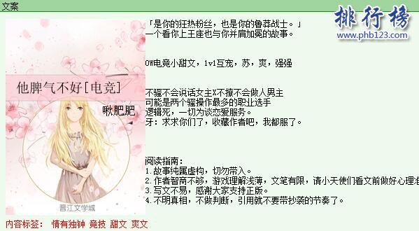 他脾气不好也是一本电竞小说,两个主角都是电竞选手,不过这本小说重点还是在恋爱,两个人骚话连篇,有很多比较经典的话,让人看了不由姨妈笑,而且里面游戏描写的也不太多,不会玩的也可以入坑。